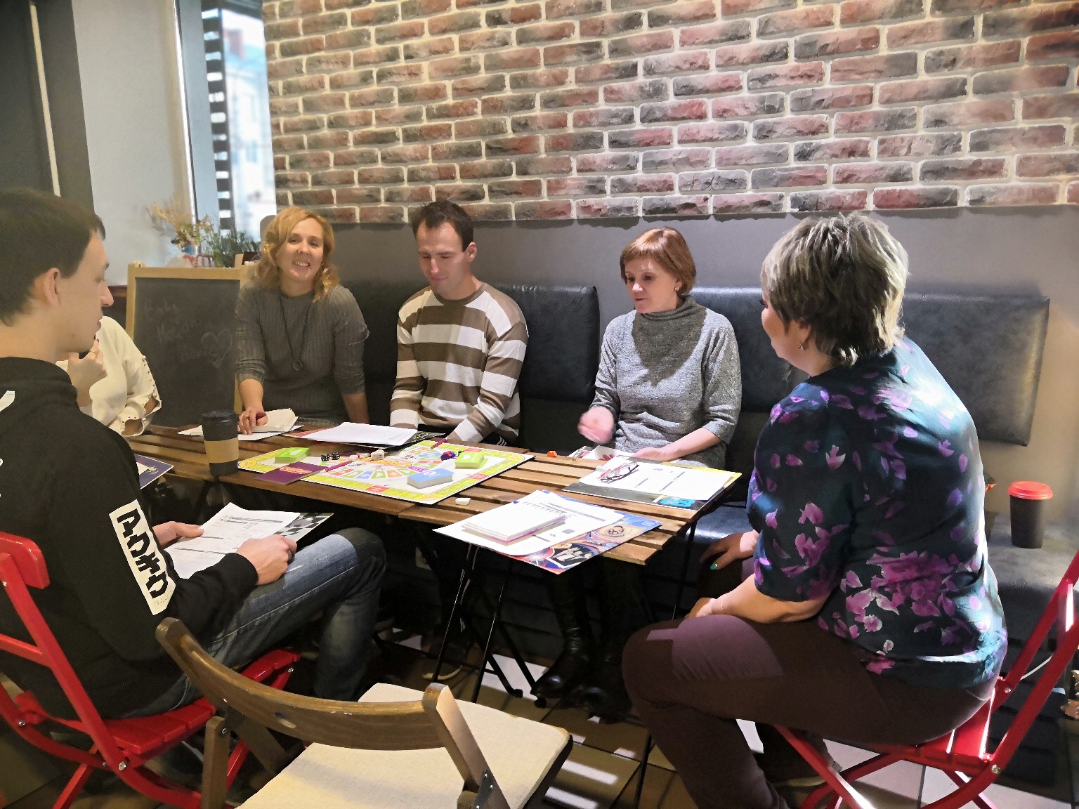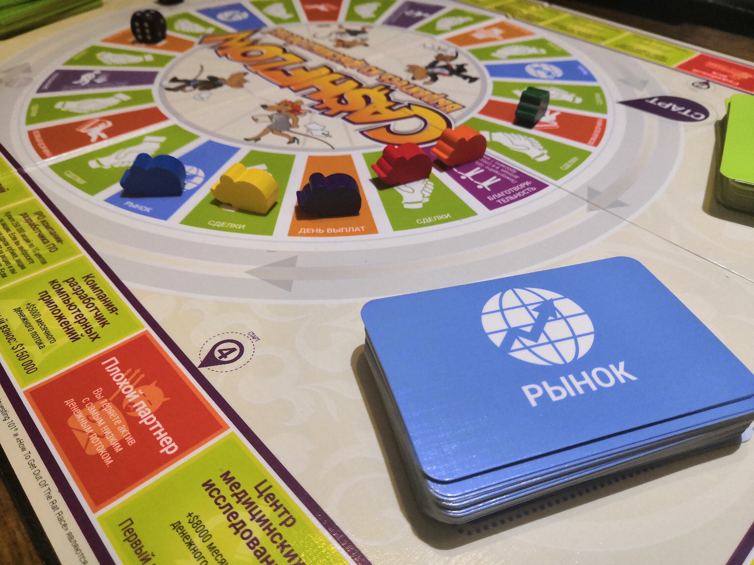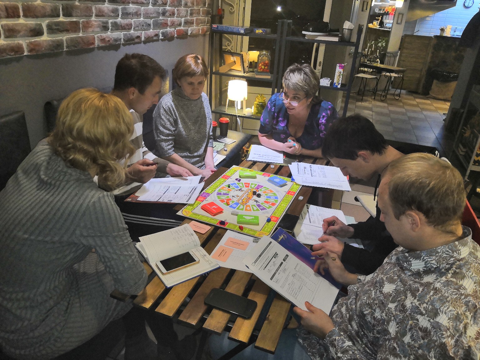 Мы собрались в арт-кофейне «Beavers». Игроков шесть, один ведущий – Татьяна. Игра внешне похожа на «Монополию», правда, считать нужно больше, как мне показалось.Одно игровое поле, поделенное на 2 тура. Внутри первый тур – «крысиные бега», из него все хотят выбраться во второй тур. Там и ставки больше и денежный поток больше. Каждый игрок ходит своей фишкой то количество шагов, которое выпало на кубике и сталкивается либо с выгодными приобретениями, либо с проблемными вопросами, которые можно решить за счёт своих средств или кредитов в банке. Кто первым набрал определенную сумму, тот и победитель.