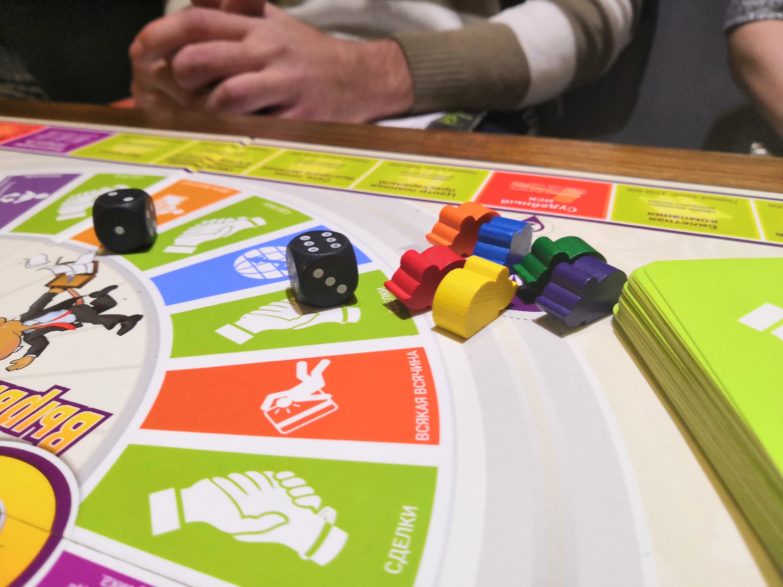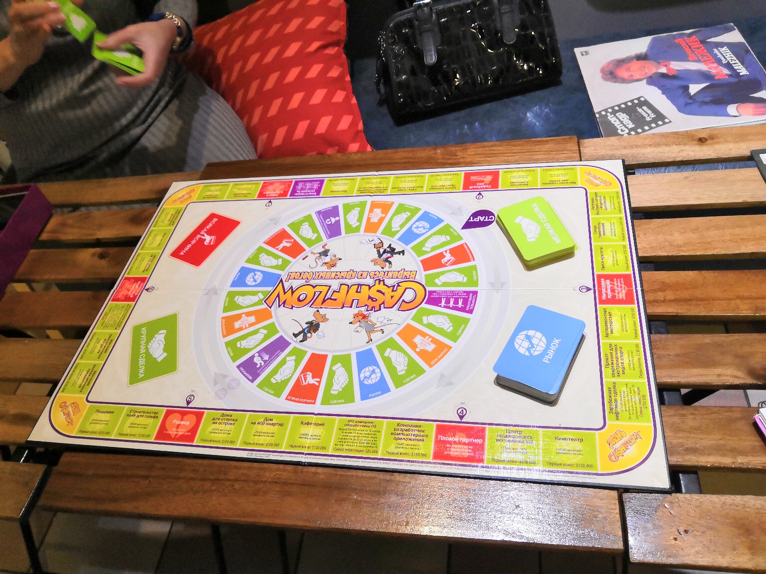 Мы собрались в арт-кофейне «Beavers». Игроков шесть, один ведущий – Татьяна. Игра внешне похожа на «Монополию», правда, считать нужно больше, как мне показалось.Одно игровое поле, поделенное на 2 тура. Внутри первый тур – «крысиные бега», из него все хотят выбраться во второй тур. Там и ставки больше и денежный поток больше. Каждый игрок ходит своей фишкой то количество шагов, которое выпало на кубике и сталкивается либо с выгодными приобретениями, либо с проблемными вопросами, которые можно решить за счёт своих средств или кредитов в банке. Кто первым набрал определенную сумму, тот и победитель.