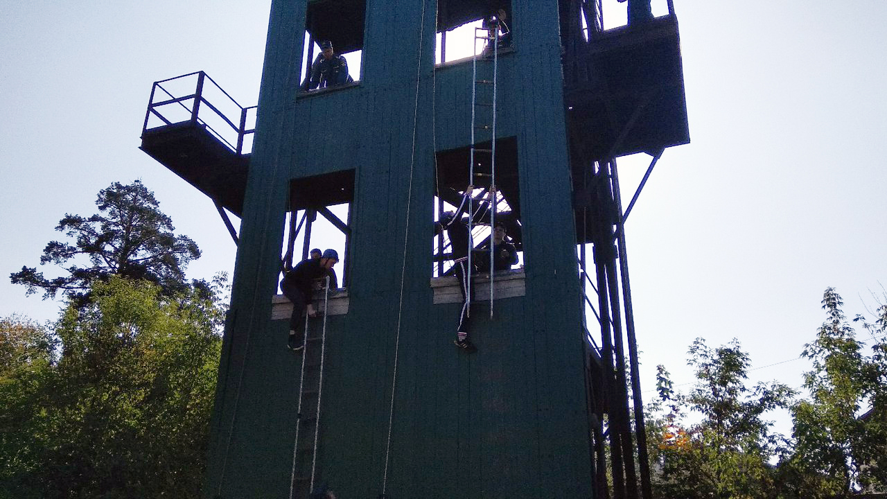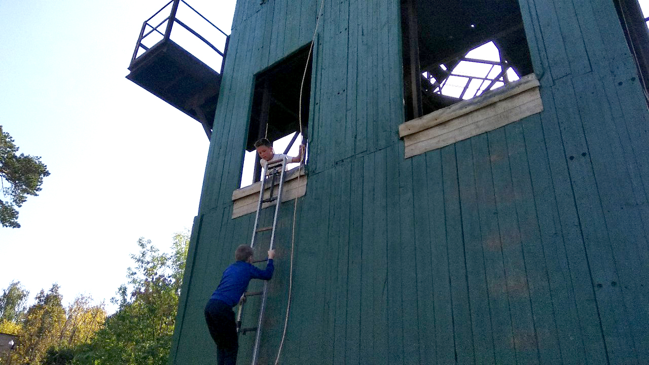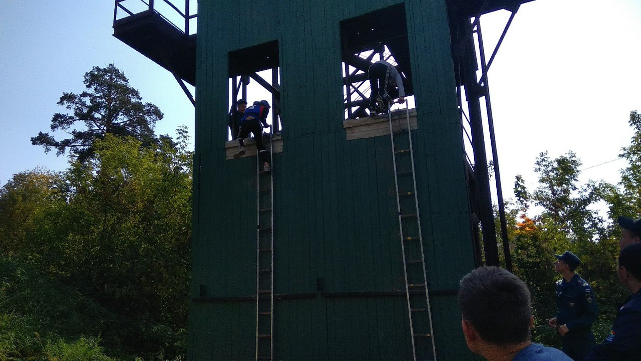Второй этап проходил на территории пожарной части №16. Там спортсмены поднимались по лестнице на штурмовую башню. Самым взрослым нужно было приставить лестницу, забраться на второй этаж, а затем, переставив лестницу, забраться на третий. Старшая группа выполняла упражнения со страховкой. Средняя группа также бежала с лестницей, приставляла её и забиралась на второй этаж башни. А младшей группе и всем девушкам нужно было по уже приставленной лестнице забраться на второй этаж.