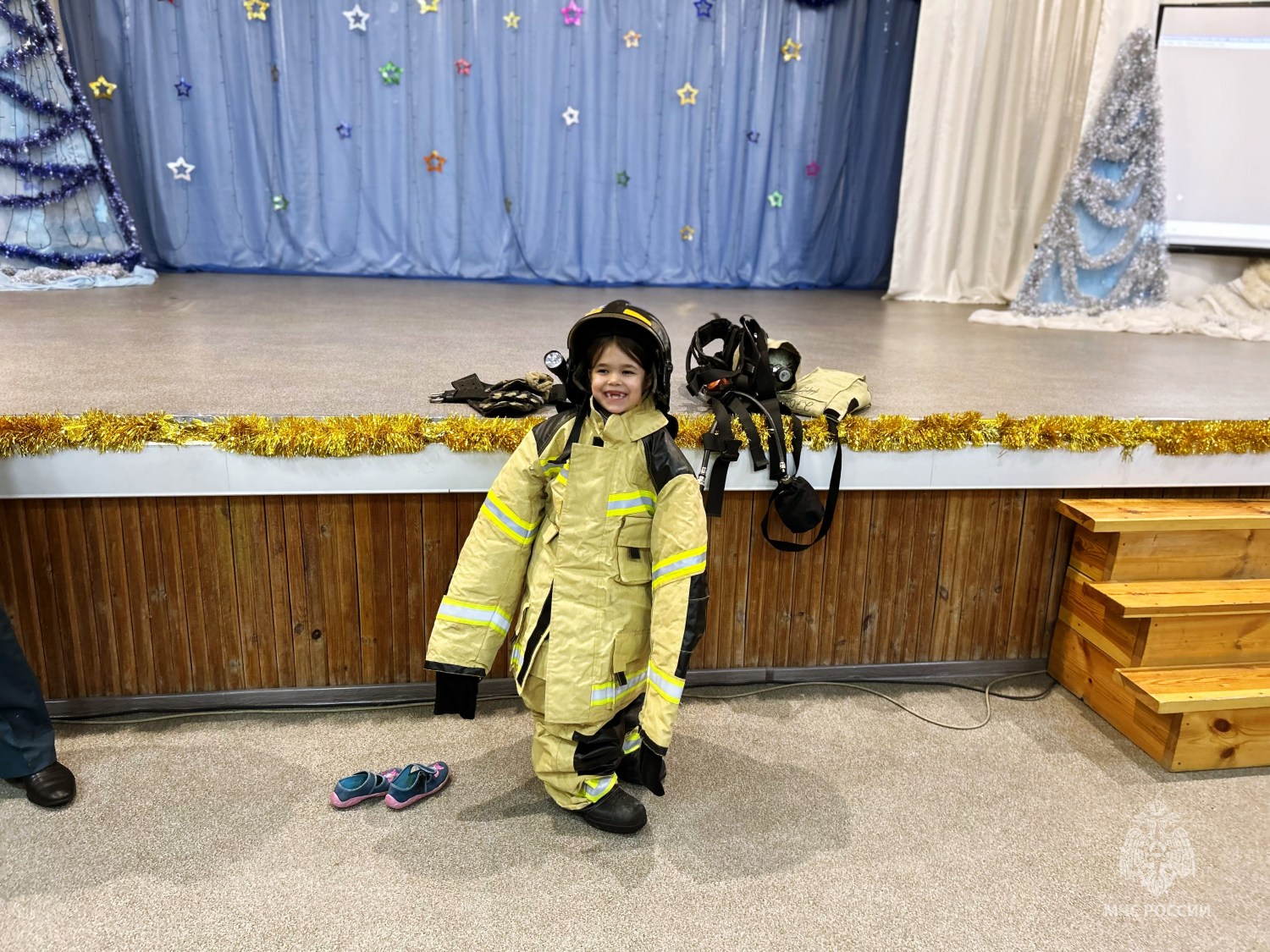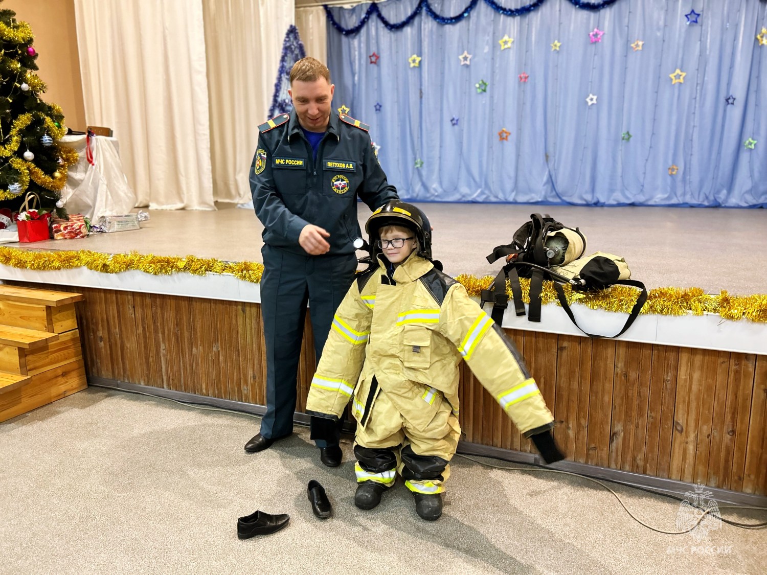 В конце занятия дети также смогли поближе познакомится с работой пожарного. Сотрудники МЧС России рассказали о своей работе и предложили выполнить один из нормативов – надевание боевой одежды.
