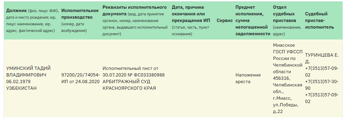 Все эти действия Тадия Уминского привели к тому, что компания «УралазТехноЦентр» просто не в состоянии ответить по всем накопившимся обязательствам кредиторов. Поэтому в июле 2020 года был наложен арест на имущество Уминского, в том числе на долю в «УК «Кристалл Сервис». Более того, был наложен арест на имущество самой управляющей компании. Тем самым, всё идёт к тому, что по долгам Уминского, возможно будут отвечать жители домов, которые обслуживает «Кристалл Сервис». Или потенциальные избиратели, которые вдруг захотят его поддержать на предстоящих выборах.